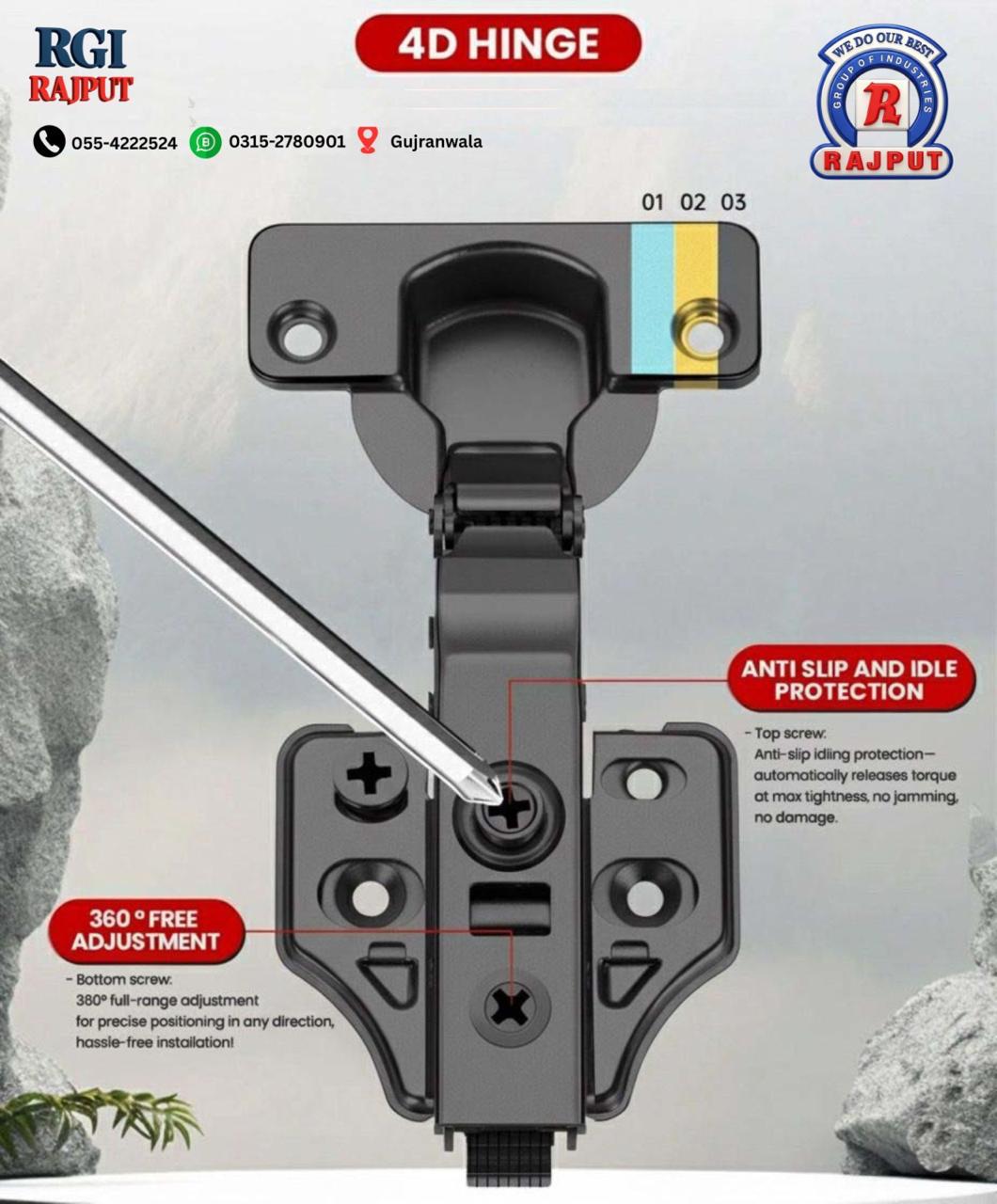 Achieve absolute precision in cabinetry alignment with the RGI 4D Hydraulic Hinge, a high-performance solution engineered for those who demand perfection. Designed by Rajput Group of Industries, this advanced hinge combines heavy-duty construction with intelligent adjustment technology, ensuring flawless door positioning, silent soft-close action, and long-term reliability in premium installations.