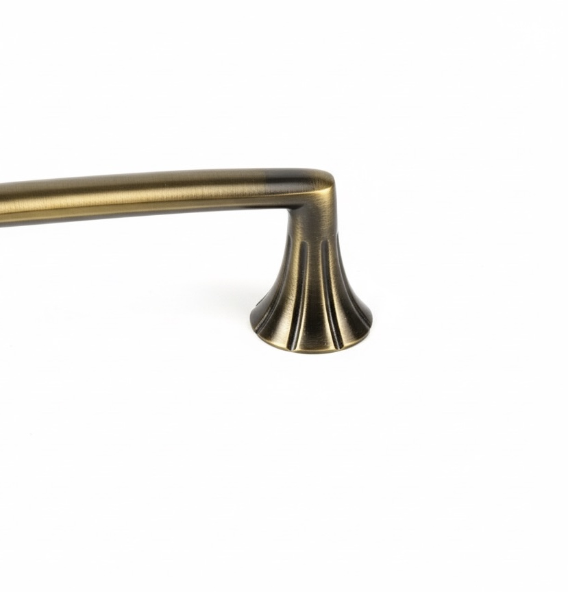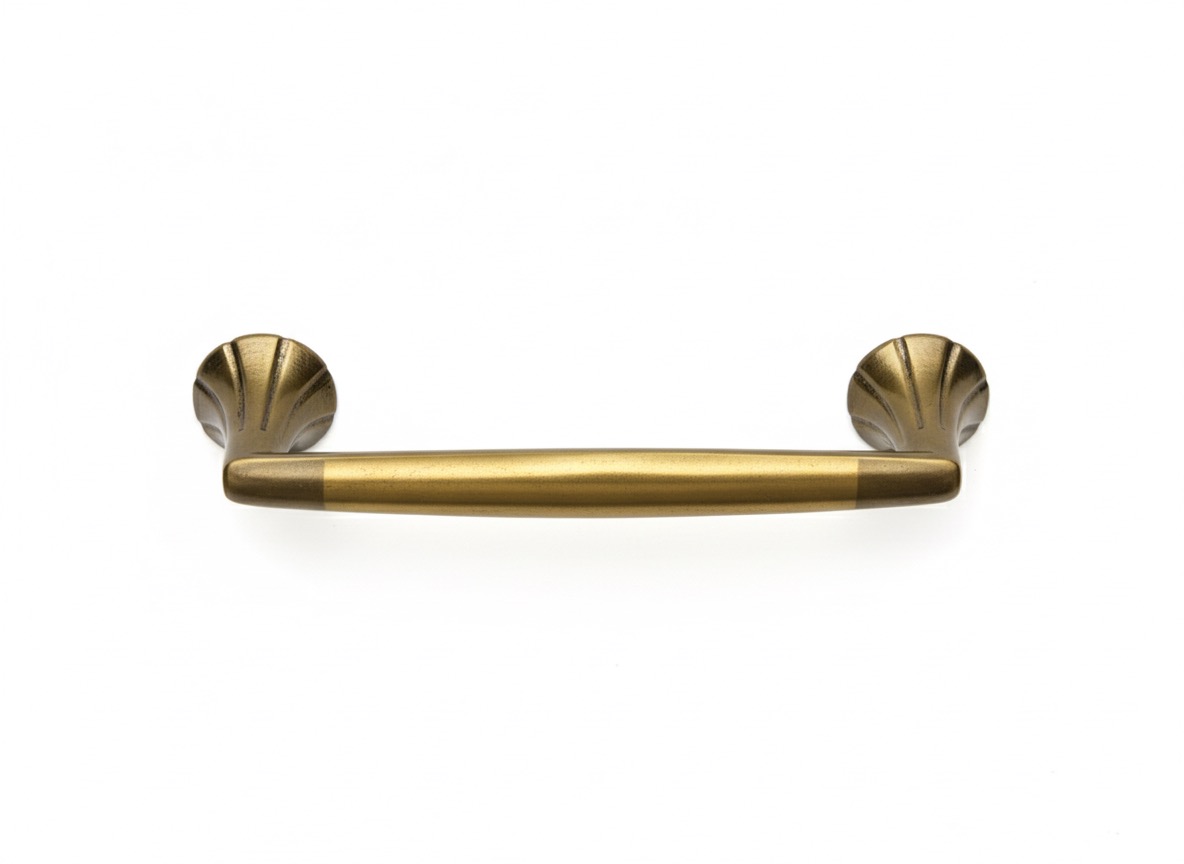 Architectural Fluted Bases: The handle is anchored by two decorative, fan-shaped mounting feet with vertical ribbing, adding a touch of classical texture to any cabinet surface.