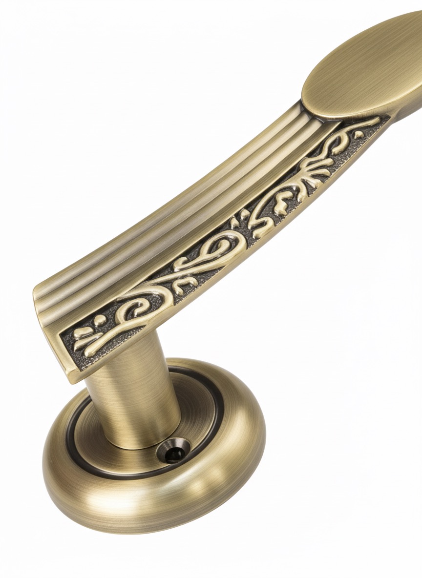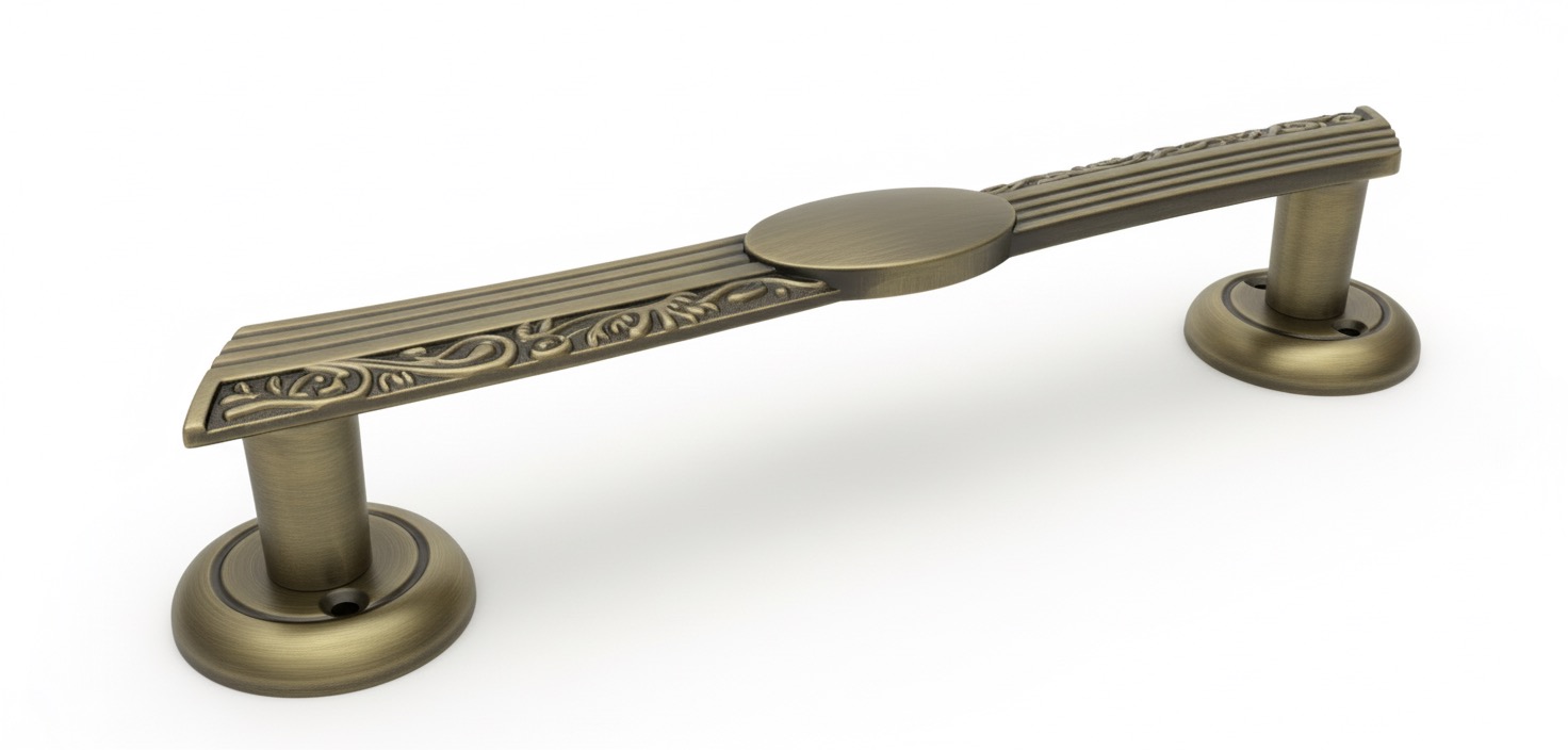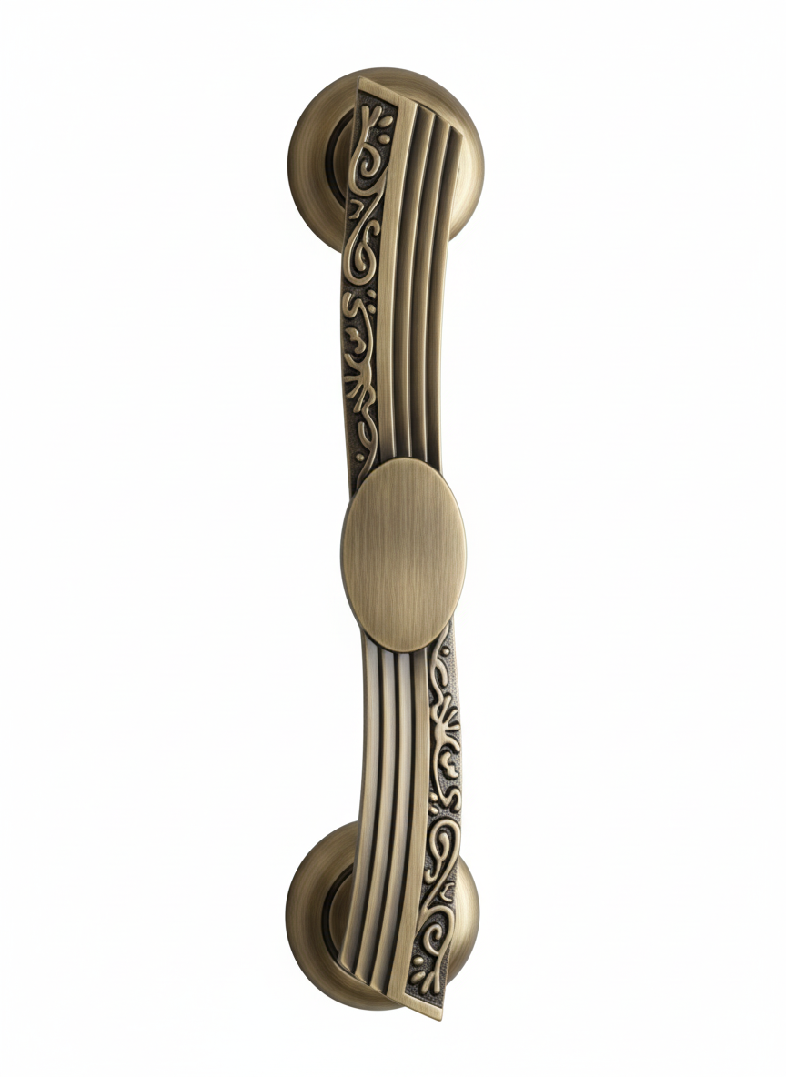 The 764 Designer Door Handle is a refined medium-sized hardware piece that artfully balances geometric precision with classical ornamentation. Its gently curved central body is highlighted by bold vertical linear grooves, while an elegant oval medallion at the center creates a striking architectural focal point. Surrounding the linear core, high-relief scrollwork detailing adds depth, heritage character, and artisanal richness—making this handle a sophisticated enhancement for premium interiors.